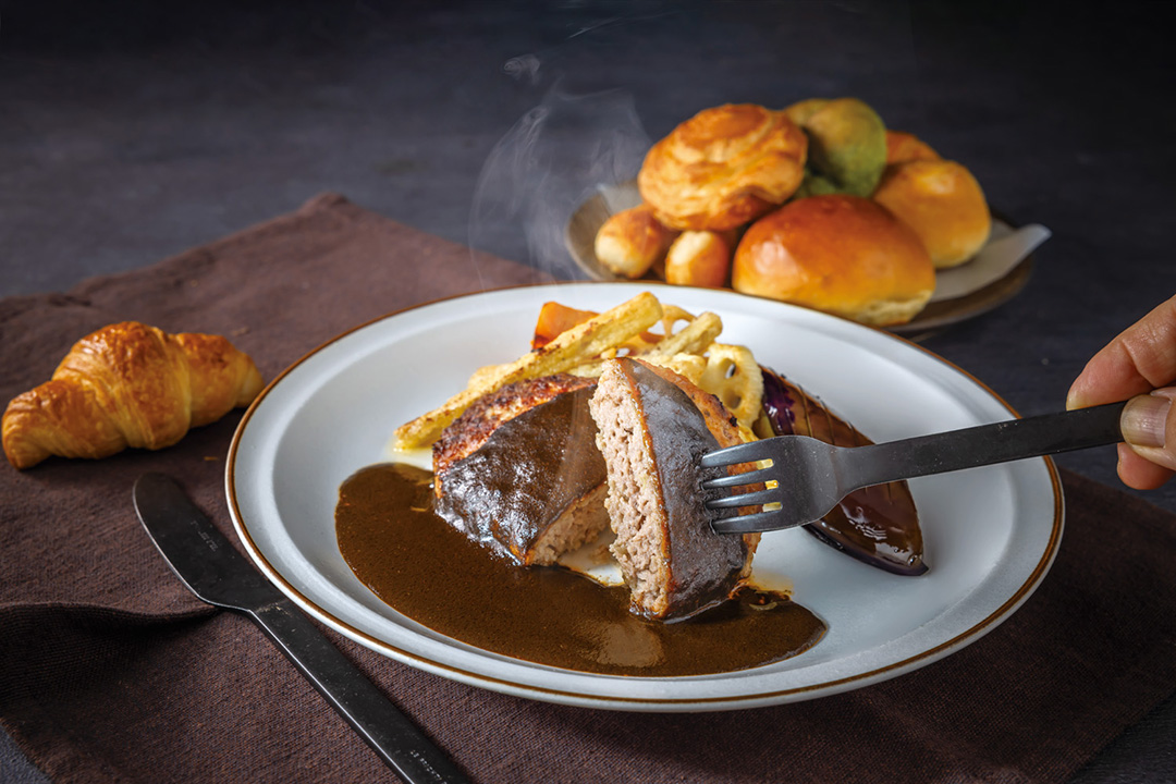 旨みあふれるハンバーグに黒ごまの香ばしさを効かせた濃厚ブラックデミソースを合わせました。