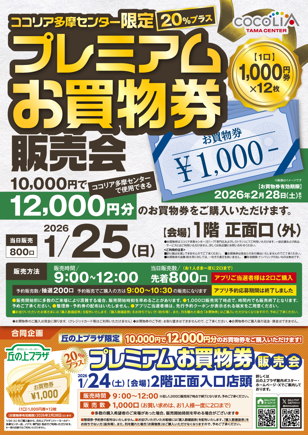 ココリア多摩センターで使用できるお買物券10,000円で12,000円分ご購入いただける販売会を実施いたします。