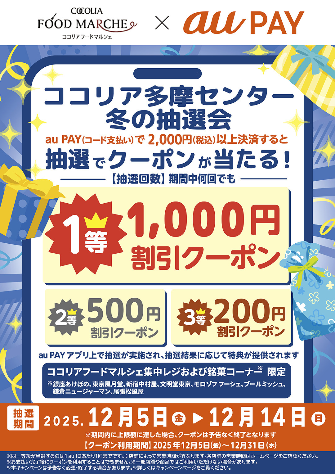 2025年12月5日㈮から12月14日㈰まで、ココリアフードマルシェ 食品集中レジ対象店舗と銘菓コーナー限定で、1回2,000円(税込)以上のau PAY(コード支払い)で使える5%割引クーポン(最大1,000円)をプレゼントするキャンペーンを開催。