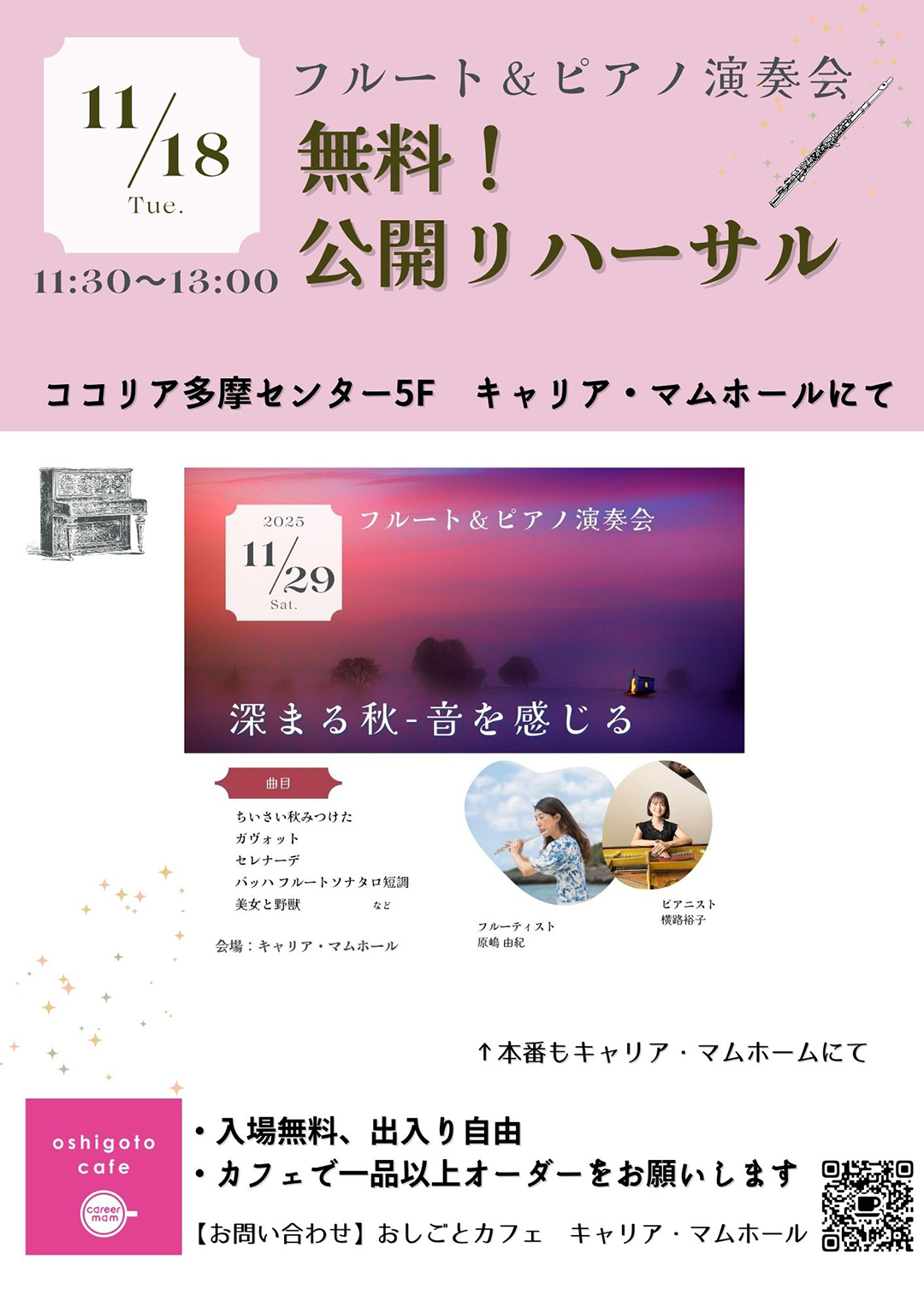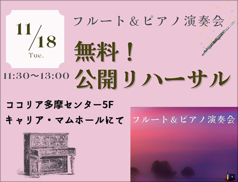 11月29日㈯に、フルーティストの原嶋由紀さんとピアニストの竹山由美子さんによるフルート&ピアノ演奏会が開催されます!