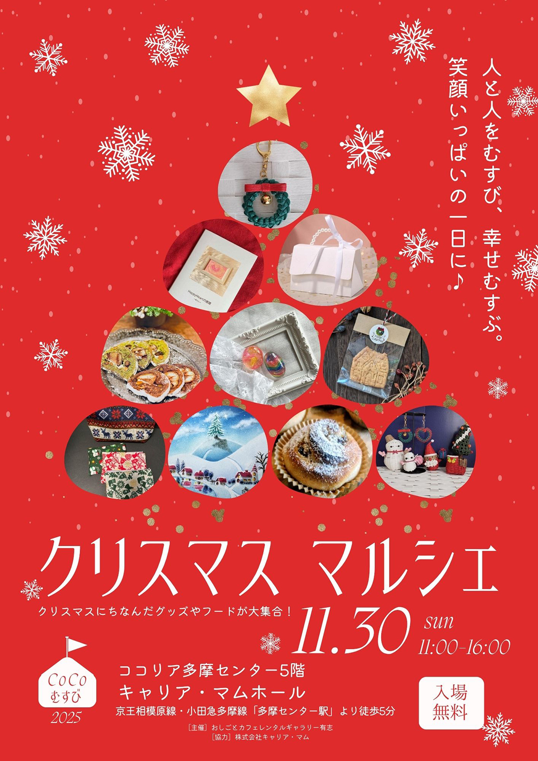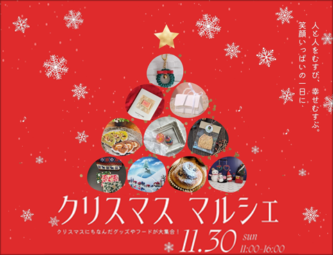 マムホールに、クリスマスにちなんだ雑貨やフードが大集合!人と人をむすび、幸せをむすぶ~笑顔いっぱいのイベントです。